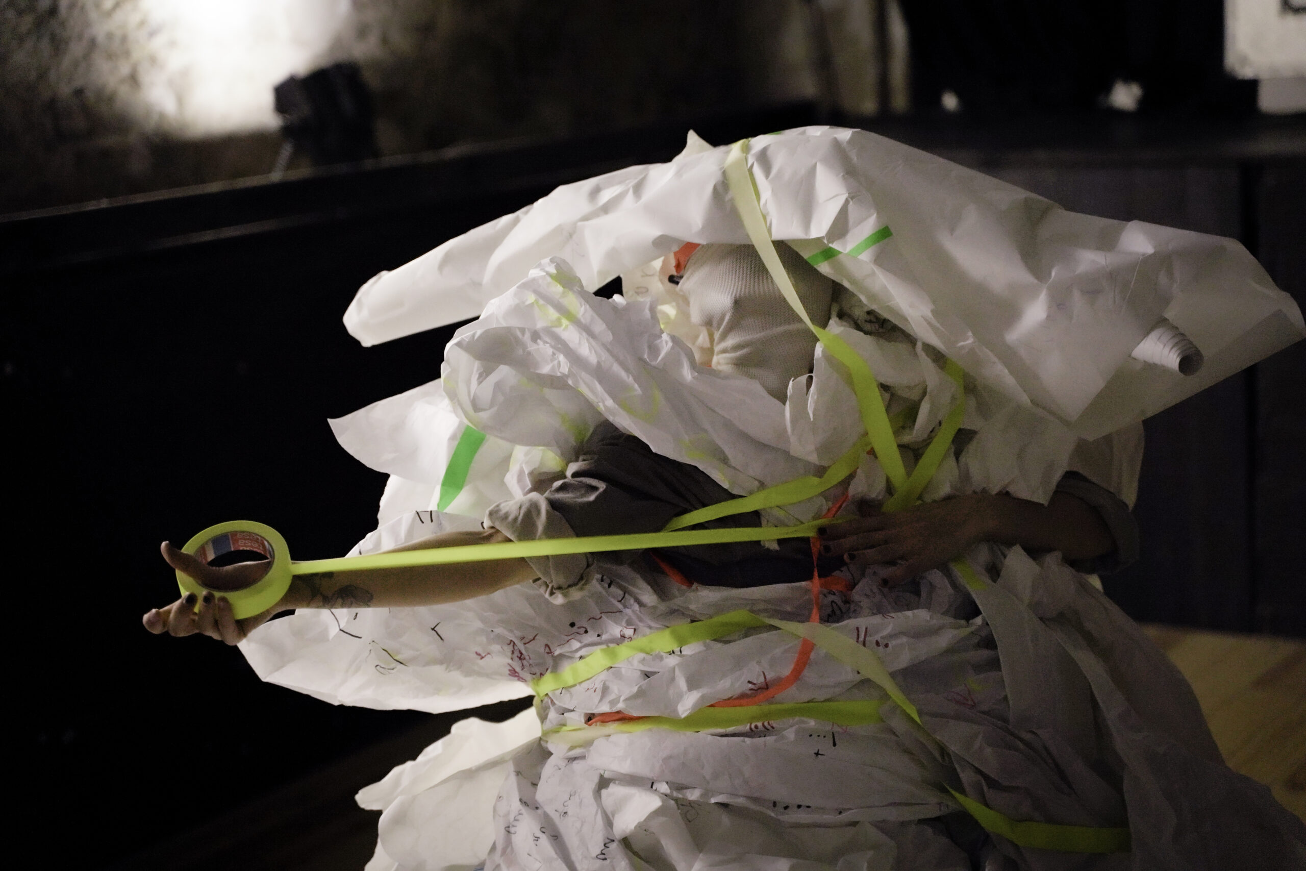 the book of sand [module solo] that has a subtitle EL CUERPO EMIGRANTE CARRYING SH!T, explores themes of liminal identity, displacement, and the “othered” body as a living archive. the body is understood as a repository that carries within it layers of micro and macro histories inscribed in its DNA, constantly shaped by processes of mutation and transformation. as both biological and symbolic matter, the body is metaphorically represented by paper densely covered with information: genetic codes, maps, and choreographic scores. these inscriptions evoke the adaptive strategies that the liminal body must invent in order to navigate complex, unstable, and unconventional structures of survival.